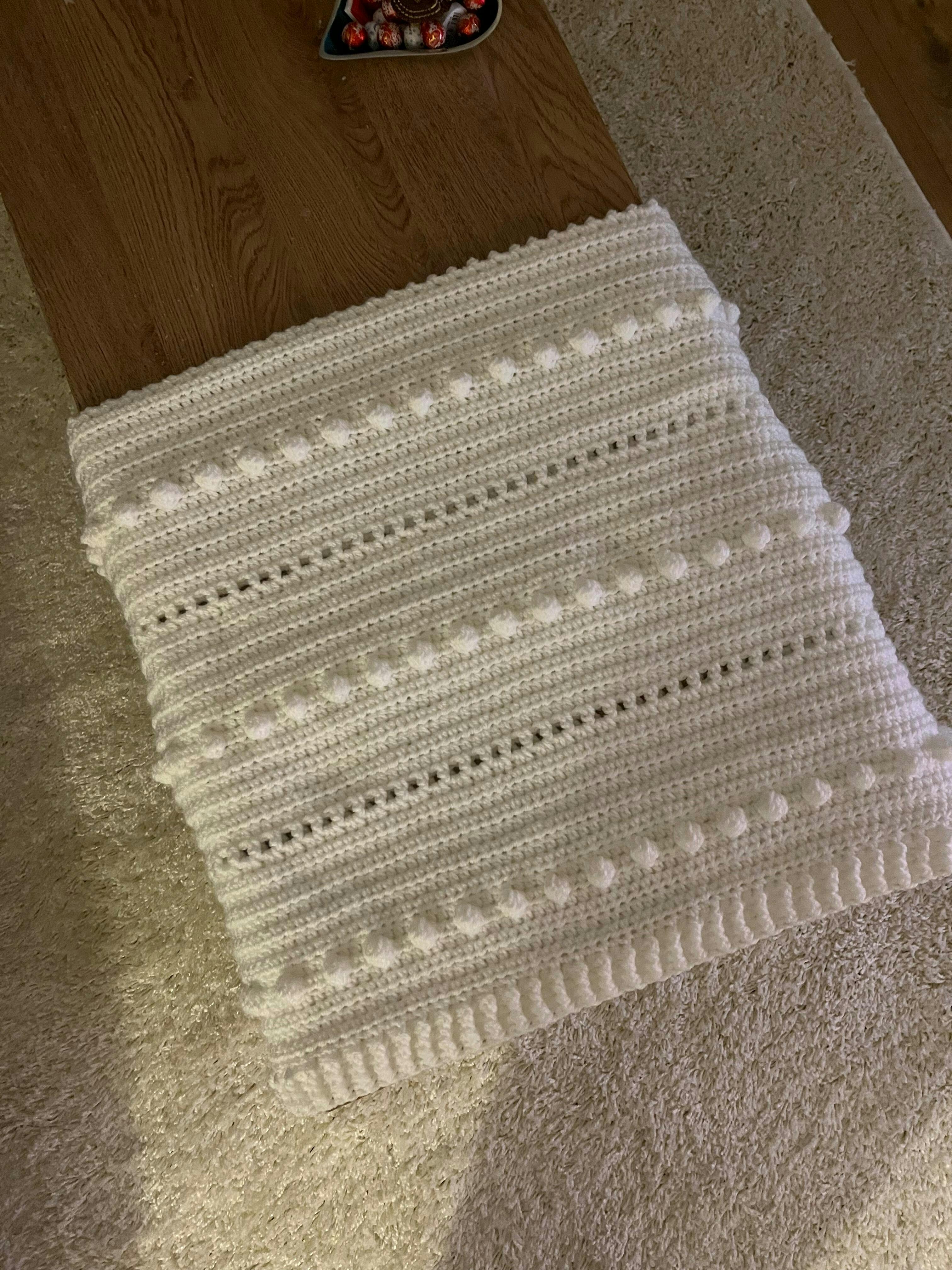 Crocheted with alternate rows of filet stitches and contrasting bobbles!