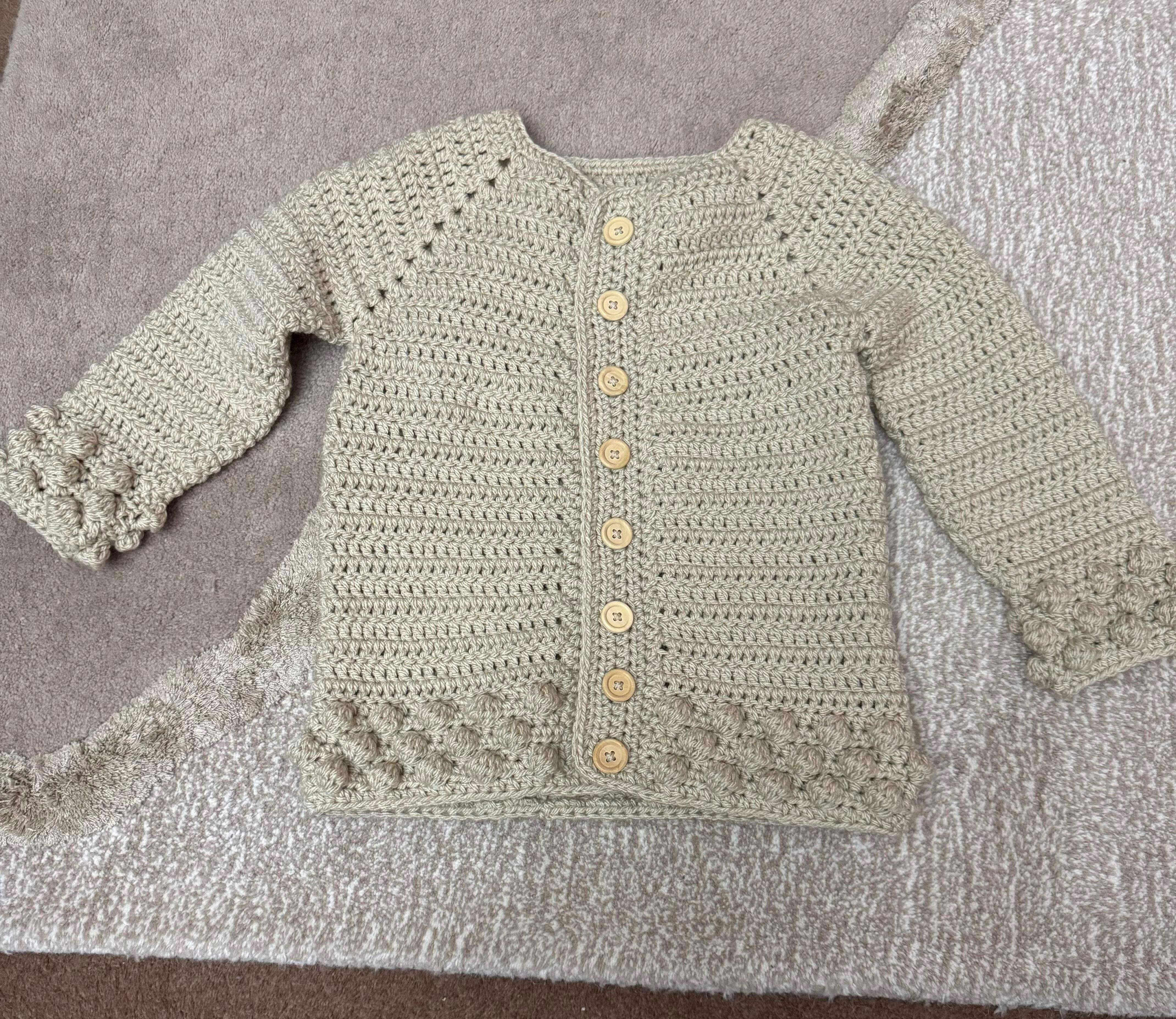 The Little Puffs Coatigan is just so snuggly and warm. Designed with raglan sleeves for a lovely fit and cute rows of puffy bobbles on the hem and sleeves! Suitable for both boys and girls, it looks great in any colour! 😊